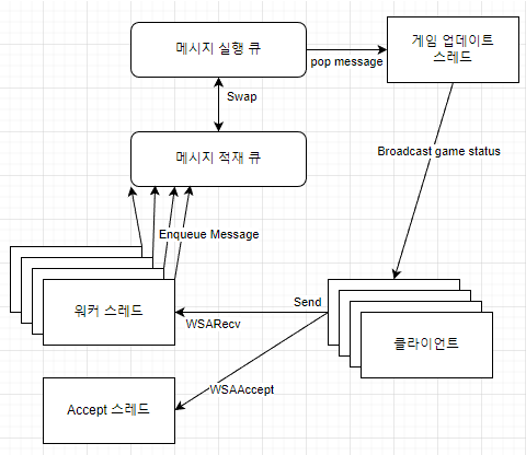워커 스레드는 클라이언트의 입력 패킷이 들어왔을 때 이를 세션 정보와 대조해 게임 업데이트를 위한 알맞은 메시지를 생성해 메시지 큐에 넣는다. 게임 업데이트는 워커스레드와는 별개로 매 게임 루프가 실행될때마다 워커 스레드가 쌓아놓은 메시지 적재 큐는 게임 업데이트에서 사용하는 메시지 실행 큐와 스왑되고, 메시지 실행 큐로 넘어온 메시지들은 게임의 상태를 갱신하는데에 쓰인다.