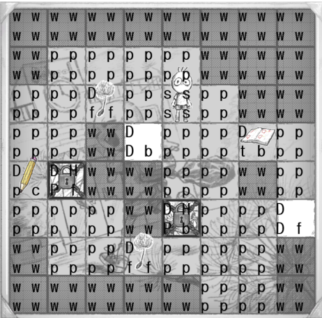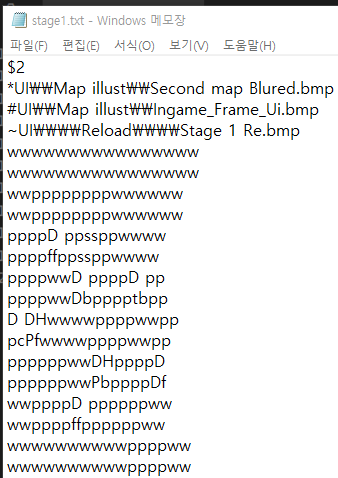 각 스테이지마다 타일과 오브젝트의 배치도는 메모장으로 작성했다. 문자 4개로 하나의 타일에 대한 정보를 기록했다.