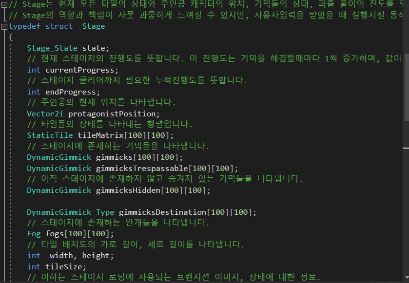 Stage는 주인공의 상태, 주인공의 위치, 스테이지 타일의 배치와 스테이지 위 오브젝트들의 위치 등, 현재 스테이지를 진행하는데 필요한 모든 맥락을 저장했다. 인게임 로직이 크게 어려울 것이 없었기 때문에, 구현을 여러 코드에 산재시키지 않기 위해 모든 원죄를 짊어진 구조체를 만든 것이다.