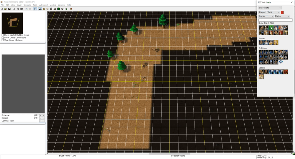 프로젝트를 시작하기 이전에 기획자로부터 어떤 게임을 만들 생각인지 대강의 설명을 들었다. 쿼터뷰 시점의 다중 유닛 컨트롤 게임이자, 실시간 전투와 시간정지 플레이가 혼재된 액션 게임이라고 설명을 들었다. 그렇지만 내가 이해한 바가 기획자의 생각과 일치하는지가 여전히 모호했다. 앞으로 장기간 협업하게 될 테니 서로 생각하고 있는 게임의 형태를 처음부터 확실하게 공유하고 싶었다. 마침 게임의 형태가 RTS 게임과 비슷했고, 나는 RTS 게임 워크래프트 3의 맵 에디터 기능을 능숙하게 다룰 수 있었기 때문에 짧은 시간 안에 프로토타입 게임을 먼저 만들었다.