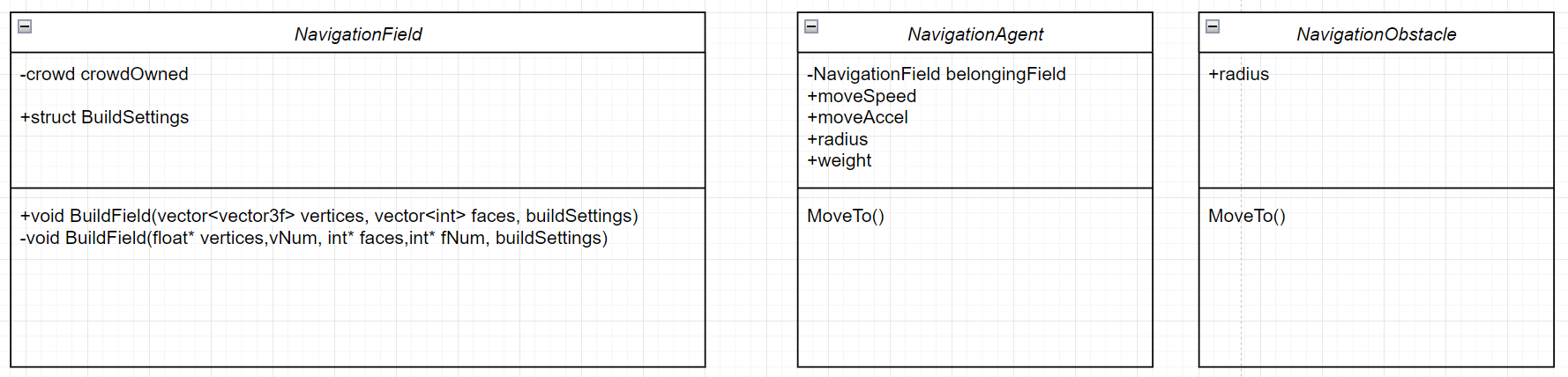 라이브러리의 데모 프로젝트의 코드를 참고해 게임엔진에서 NavigationField와 NavigationAgent라는 각각의 클래스로 래핑했다. 게임 엔진 사용자가 최대한 간단하게 기능을 사용할 수 있도록 인터페이스를 뚫어주고 싶었다. NavigationField는 버텍스 좌표들의 리스트만 받으면 이동가능한 지형을 생성할 수 있게 만들었고, NavigationAgent는 이동속도 설정, 충돌 크기 설정, 이동 등의 기능만 사용할 수 있게 만들었다.